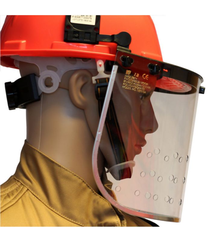- Zertifizierter Helm (EN397) mit Drehring und Kinnriemen zum Einstellen, mit Polycarbonatvisier (EN 166 1B 3) mit an den Helm angepasster - Aluminiumverstärkung und Belüftungslöchern.