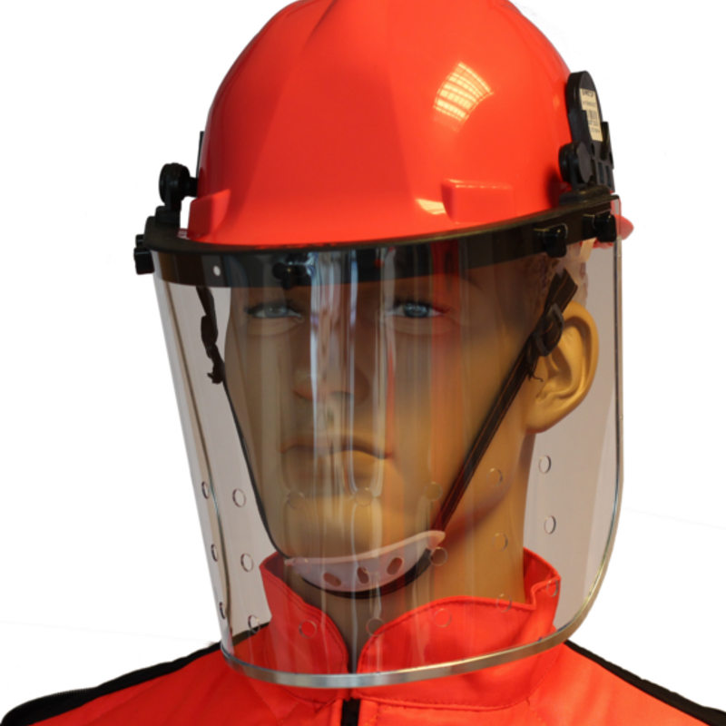 - Zertifizierter Helm (EN397) mit Drehring und Kinnriemen zum Einstellen, mit Polycarbonatvisier (EN 166 1B 3) mit an den Helm angepasster - Aluminiumverstärkung und Belüftungslöchern.