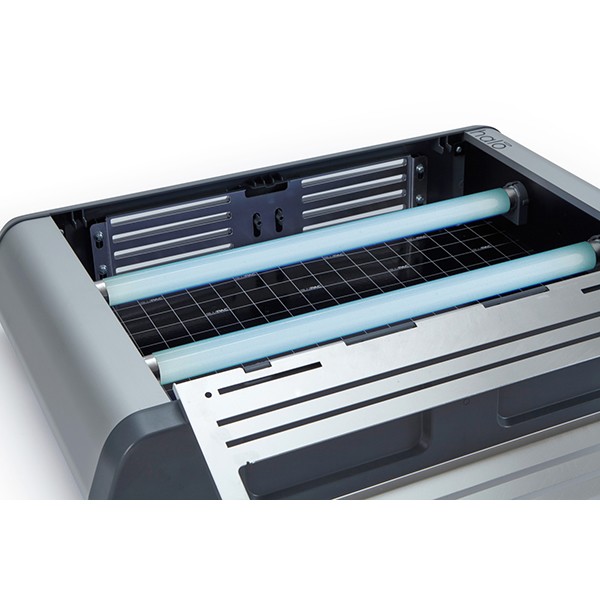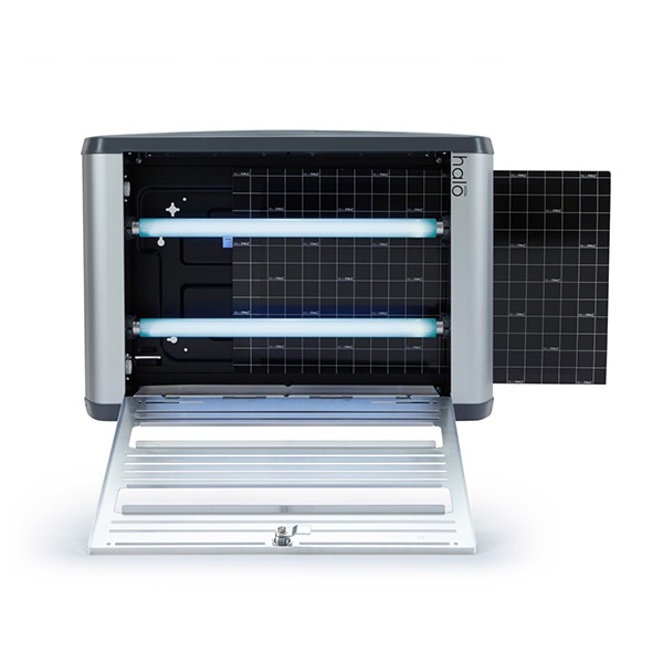 Die zweite Generation des Halo ist nun noch schneller und einfacher in der Wartung: Über die herunterklappbare Frontklappe können die UV-Röhren und Starter ausgetauscht werden. Die Klebefolie kann nun waagerecht von beiden Seiten des Gerätes getauscht werden. Das Halo ist mit hochwirksamen 15 Watt UV-Röhren bestückt, so dass nur eine Röhre für alle Modelle benötigt wird.