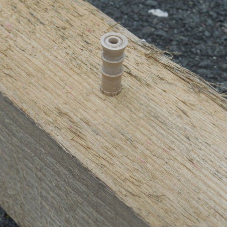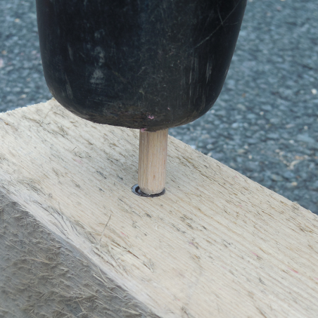 Gerillte Holzdübel. Den Holzdübel am Injektor einschlagen, um den Injektor im Holz zu versenken und zu verdecken.