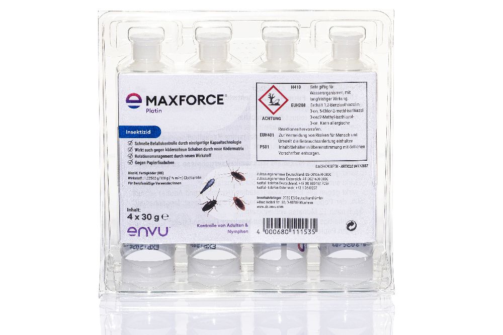 Die moderne Ködermatrix zeichnet sich durch eine einzigartige Mischung aus insektizidem Gel und fraßstimulierenden Köderkapseln aus. Sowohl Nymphen als auch adulte Schaben nehmen Maxforce® Platin unmittelbar auf, so dass eine Kontrolle von allen Entwicklungsstadien in kürzester Zeit erreicht wird. Hierbei werden auch köderscheue Schaben sicher erfasst.