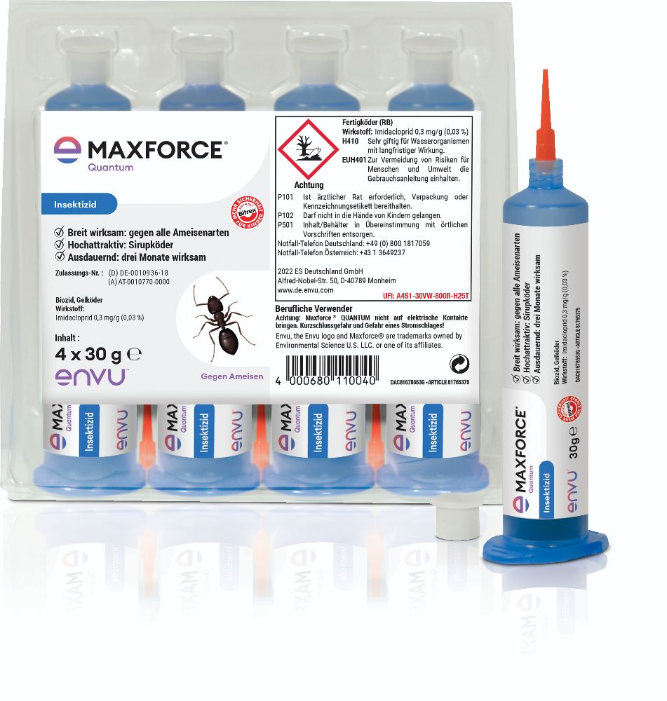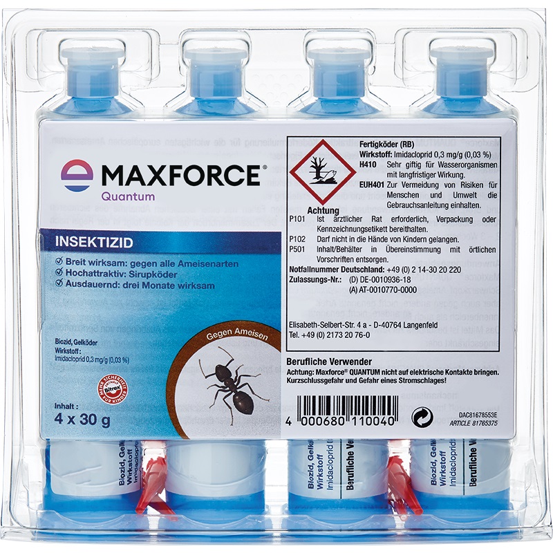 Die Erfassung des gesamten Nestes steht bei der Anwendung von Maxforce® Quantum im Vordergrund. Der hochattraktive Sirupköder wird schnell als Futterquelle von den Arbeiterameisen angenommen und in ausreichendem Maße in die Ameisenkolonie eingetragen. Die Formulierung ist hydroskopisch (trocknet nicht aus), bildet keinen Oberflächenfilm und ist damit optimal für die Ameisen aufnehmbar. Ein verzögerter Wirkungseintritt ist für eine erfolgreiche Behandlung unbedingt notwendig, um eine permanente Problemlösung (Abtötung der Königin und Brut) zu erzielen. Eine deutliche Reduzierung der Ameisenaktivität wird bereits nach wenigen Tagen sichtbar. Der Zusammenbruch der gesamten Kolonie folgt in der Regel nach 2 - 3 Wochen.