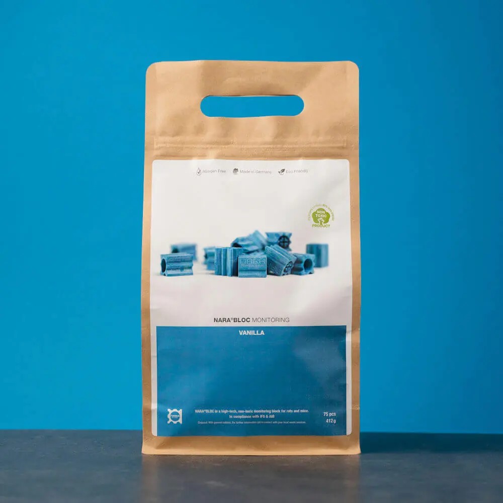 NARA BLOC ist ein high-tech NON TOX Monitoringblock für Ratten und Mäuse, bestehend aus einem aromatisierten Spezialkunststoff.