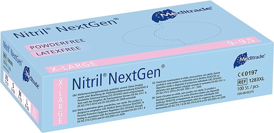 Nitril NextGen® - 100 Stück - Größe XLProduktbeschreibungNitriluntersuchungshandschuh, blau, puderfrei, latexfrei, unsteril, texturiert, Rollrand, beidhändig passend, nur für den Einmalgebrauch.InhaltsstoffeNitrilbutadienkautschuk, Antioxidans, Schwefel, Zinkoxid, Zinkdiethyldithiocarbamat, Titandioxid, Zinkdibutyldithiocarbamat, Farbpigment, Polymerbeschichtung- Untersuchungshandschuh aus Nitril gem. DIN EN 455- Hell-blau aus Nitril- Schutzhandschuh nach PSA- Puder-, protein- und latexfrei- Mikrogeraut- Elastisch und reißfest- Beidhändig passend, mit Rollrand- Geeignet für den Kontakt mit LebensmittelnGröße: XL (9-10)VE: 1 Karton á 100 Stück