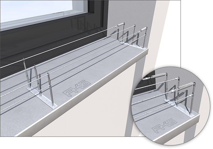 Das Trägerelement ist aus Aluminium, die Pins aus Edelstahl hergestellt. Der Abstand von Trägerelement zu Trägerelement sollte maximal 1,0 - 1,5 m betragen, die Seillänge pro Feder maximal 2-3 m, da sonst das Seil mit der Zeit zu stark durchhängt.