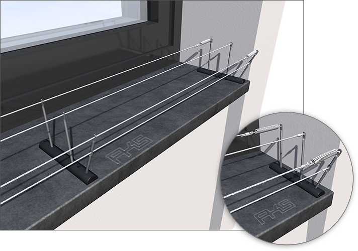 Das Trägerelement ist aus Kunststoff, die Pins aus Edelstahl hergestellt. Der Abstand von Trägerelement zu Trägerelement sollte maximal 1,0 - 1,5 m betragen, die Seillänge pro Feder maximal 2-3 m, da sonst das Seil mit der Zeit zu stark durchhängt.