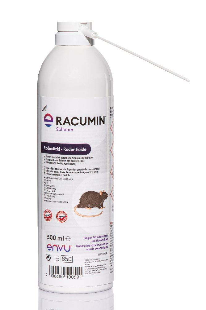 Der Racumin® Schaum wird vor allem als flankierende Maßnahme während einer üblichen Beköderung eingesetzt. In Objekten mit hoher Luftfeuchtigkeit (Schimmelgefahr von Fertigködern) mit attraktiven Alternativfutterquellen (Akzeptanzprobleme) bzw. mit „verhaltensresistenten“ Nagern (Köderverweigerung) ist mit dem Haftschaum eine erfolgreiche Nagerbekämpfung möglich. Beim Berühren des Schaums bleibt dieser am Fell der Nager haften und veranlasst diese zu starker Putztätigkeit. Auf diese Weise wird der Wirkstoff aufgenommen.