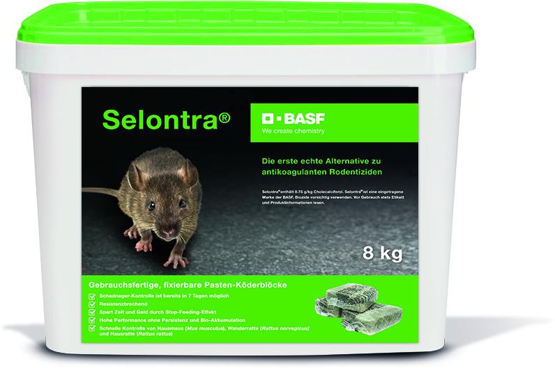 Endlich ist er da, der lang erwartete innovative und hochwirksame Köder zur Bekämpfung von Schadnagern. Selontra® mit einem völlig neuen Wirkmechanismus in einer speziellen Ködermatrix ist bereits seit Jahren außerhalb Europas eine große Erfolgsgeschichte und nun auch für professionelle Schädlingsbekämpfer in Deutschland erhältlich. Die Kombination des Wirkstoffs Cholecalciferol mit einer ungewöhnlich schmackhaften Formulierung ist genauso wirksam wie die stärksten Antikoagulanzien, ermöglicht aber eine deutlich schnellere Kontrolle.